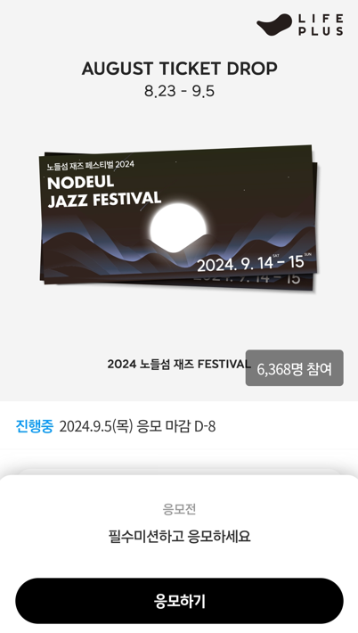 Life Plus TRIBES 앱 내 '2024 노들섬 재즈 페스티벌' 초대권 응모 접속 한 후 응모접수를 합니다.