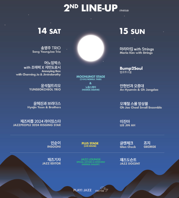 2024 노들섬 재즈 페스티벌에서는 대중가요를 이끌어가는 국내 최정상 아티스트 인순이, 죠지, 글랜체크부터 유튜브 스타 조매력과 지민도로시, 범프투소울, 이진아, 마리아킴 등 의 보름달처럼 꽉 찬 재즈 바이브를 가득 느낄 수 있습니다.